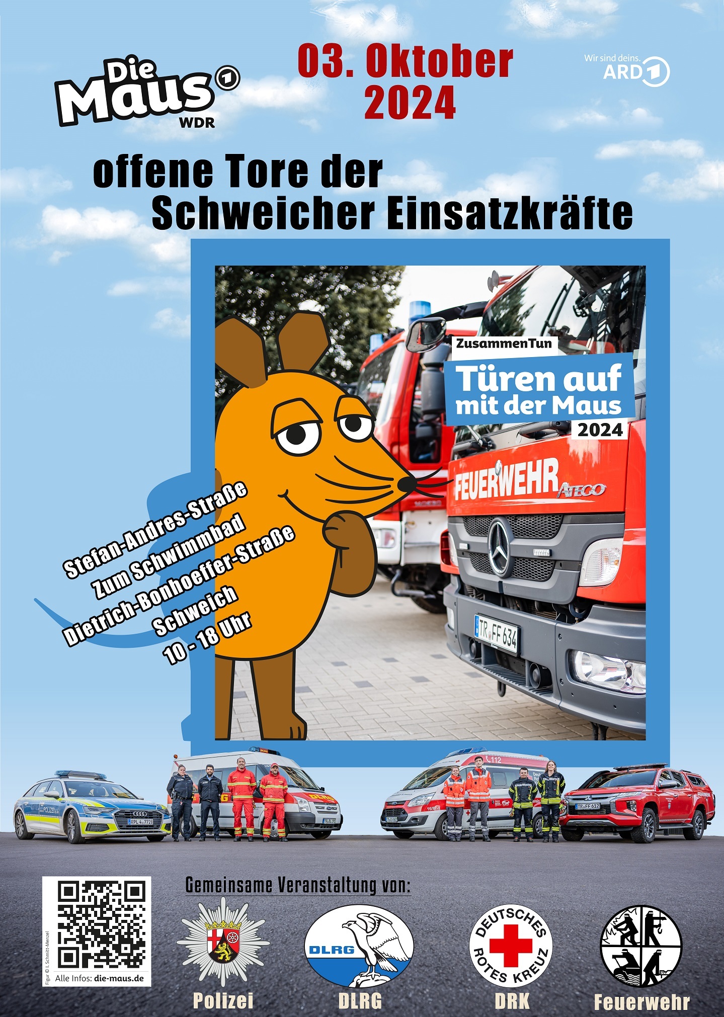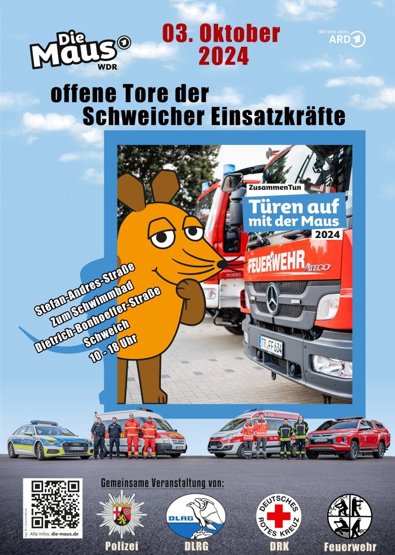 Die Schweicher Einsatzkräfte öffnen ihre Tore. Am Donnerstag, 03.10.2024 laden Polizei, Deutsches Rotes Kreuz, DLRG und Feuerwehr alle Interessierten und ganz besonders die Kinder dazu ein, sich über die Arbeit der einzelnen Hilfsorganisationen zu Informieren. Natürlich kommen auch Spiel & Spaß, sowie das leibliche Wohl nicht zu kurz.
