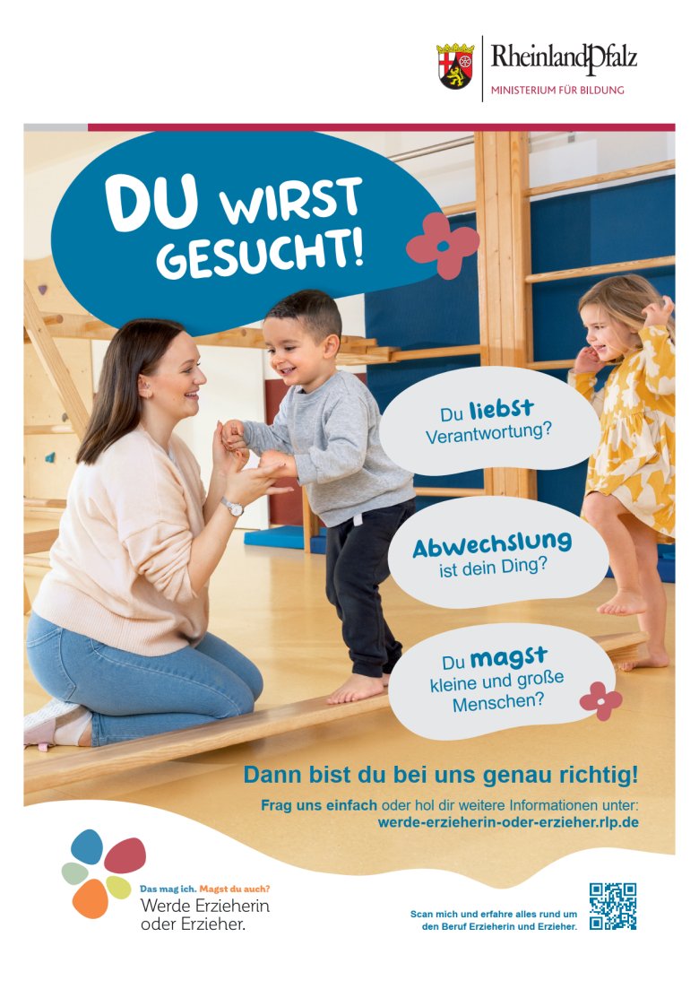 Das Land Rheinland-Pfalz - Ministerium für Bildung hat hierzu eine Fachkräftekampagne gestartet, um Menschen für den Beruf der Erzieherin / des Erziehers zu begeistern: