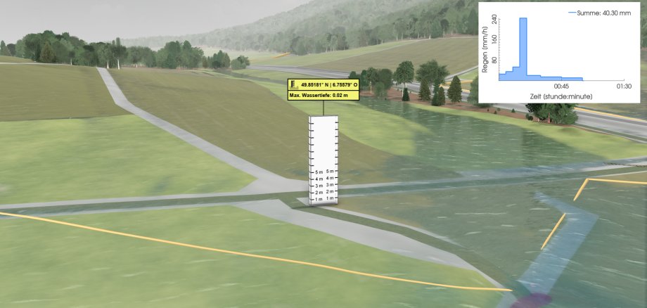 Eine Kurzanleitung hilft Ihnen, sich in dem Programm zurecht zu finden und viele Möglichkeiten der Darstellung zu nutzen, wie etwa die Wassertiefe am Gebäude, die Fließrichtung und -geschwindigkeit des Wassers oder die Befahrbarkeit der Straßen.