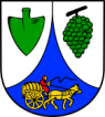 Blasonierung: In Silber eine eingeschweifte blaue Spitze, darin – gelenkt von einem rotgewandeten Fuhrmann – golden eine Karre mit aufgeladenem Weinfass und vorgespanntem, nach links ziehendem Pferd. Vorne eine grüne (oder schwarze) Pflugschar. Hinten eine grüne Weintraube